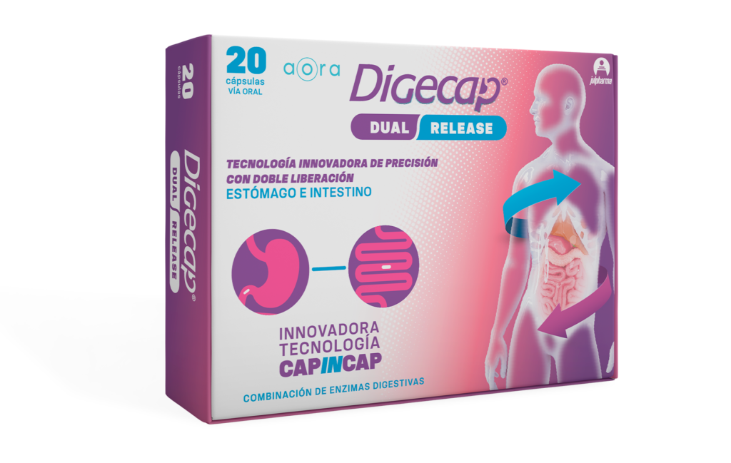 Con Digecap DualRelease la digestión de carbohidratos, proteínas y grasas comienza en el estómago, ayudando al intestino a centrarse en la absorción de nutrientes y el reequilibrio de la microbiota.